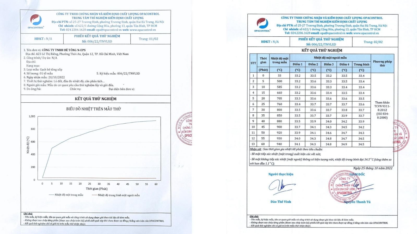 Hình. Kết quả test sau khi gia nhiệt mặt trước 1000 độ C thì mặt sau của tường bê tông nhẹ eps chỉ tăng có 1.1 độ C so với nhiệt độ ban đầu.