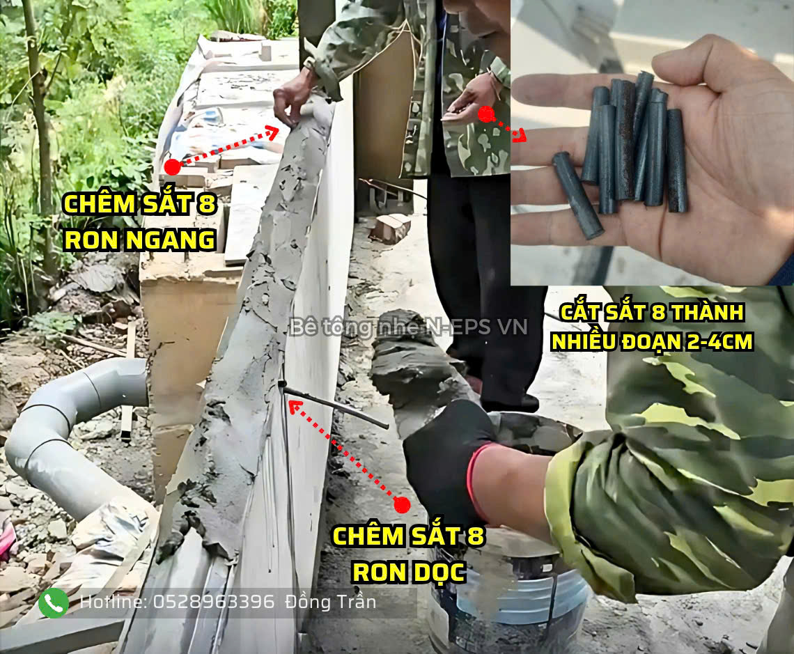 Lưu ý: Để tất cả các mạch vữa được đều thì sau khi trét vữa vào cạnh tấm, chêm ngay các đoạn sắt 8 (sắt 8 đã cắt ngắn nhiều đoạn 2-4cm trước đó) để chèn vào mạch vữa, lúc lắp tấm vữa sẽ không bị ép tràn hết ra ngoài. Đây là 1 lưu ý cực kỳ quan trọng giúp chống nứt tường.