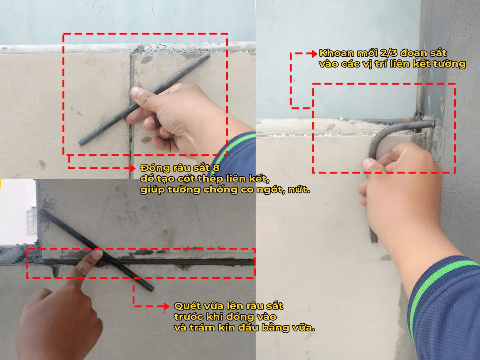 Hình. 3 vị trí ngoài liên kết vữa vào ngàm âm dương sẽ phải đóng râu sắt 8 tạo cốt thép liên kết mối ghép nối tường. Giúp tường chống co ngót, chống nứt các vị trí mối ghép. Các vị trí này trước khi đóng râu phải được khoan mồi 2/3 đoạn sắt, khi đóng phải được quét vữa vào râu sắt trước khi đóng và trám bịt đầu bằng vữa trước khi lắp tấm tiếp theo để đạt hiệu quả tốt nhất.