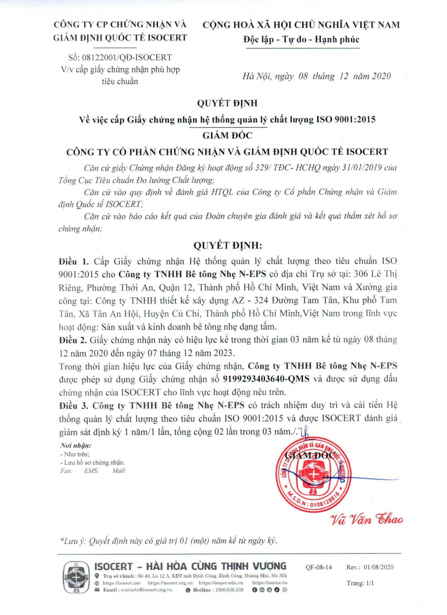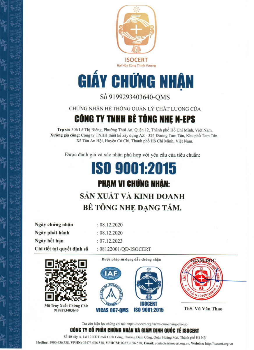 - Chứng nhận ISO 9001:2015 về quản lý chất lượng sản xuất bê tông nhẹ.