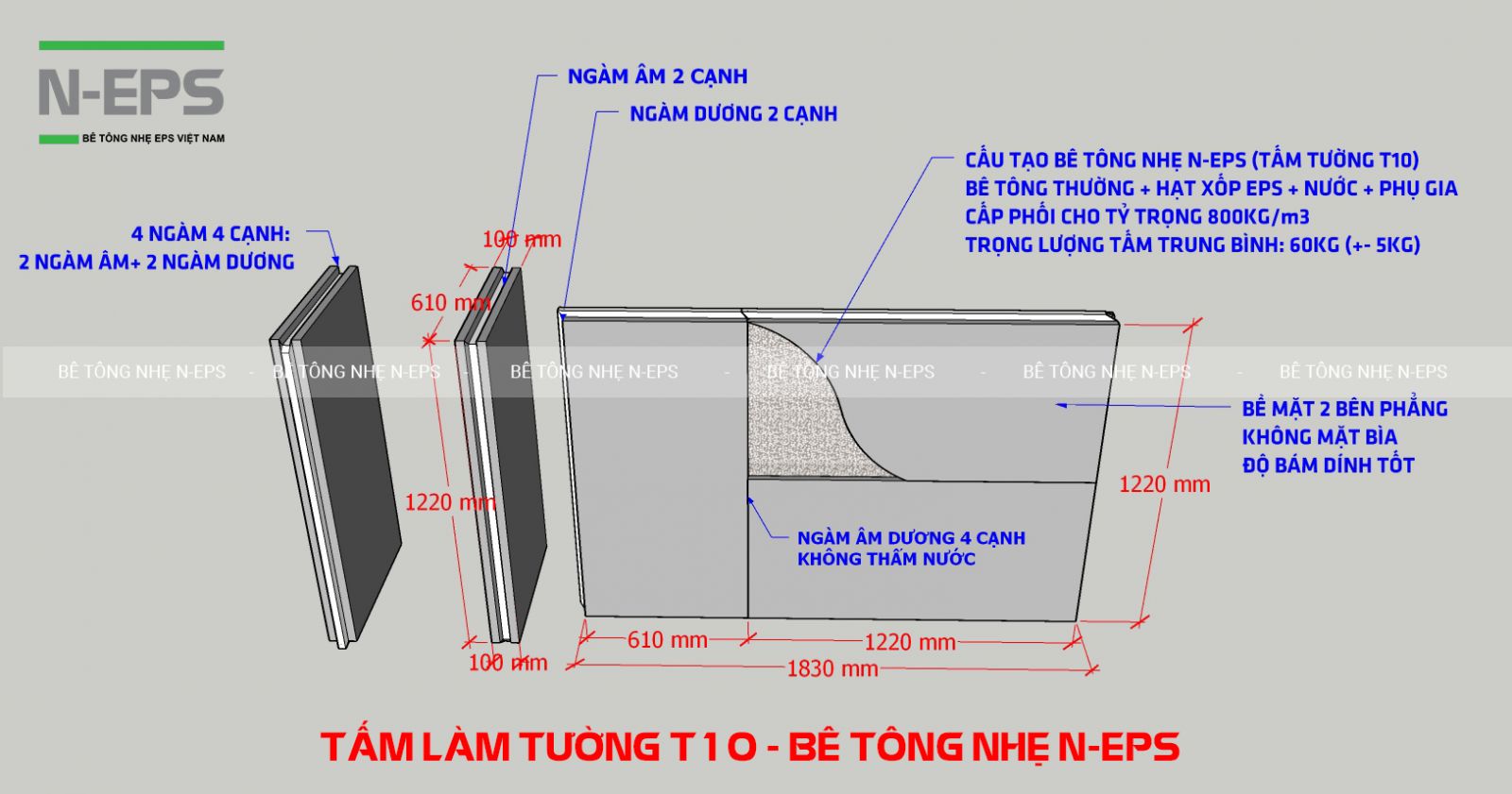 - Tâm Tấm bê tông nhẹ EPS T10: Ngang: 61cm x Dài 1.22m x Dày 10cm